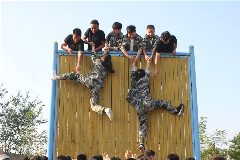 “翻越毕业墙”是整个训练中让我最真切的感受到什么叫团队的一个项目。当我们150多个人站在四米多高,没有任何辅助物的毕业墙面前的时候,大脑惯有的思想告诉我:我不可能爬上去。可是后来的事实证明了我对团队力量的无知。当教官给我们讲解了只能靠搭人梯翻越毕业墙的方法之后,我更迷茫了,两个人的高度也不太可能啊。当我们的翻越正式开始了以后,我看到了自己不曾想到过的一幕,下面一排排由我们团队的英雄们搭起的人梯,坚固而有力的支撑着第一批的人成功翻阅,让我看到了成功真的不是那么难,随后我们一批批的人争先恐后的都翻越了那面墙。下面是坚持护送兄弟姐妹翻越的英雄们,上面是对兄弟姐妹不离不弃的战友们,翻越结束了,我们156个人的用时不是大家猜想的2个小时,1个小时,甚至是半个小时,而是一个我们想都没有想过的数字:16分58秒45。看着肩膀上被我们踩出血痕的战友们,看着上面帮助战友累出眼泪的同事们,我才了解就因为我们是一个队伍,我们才会甘于牺牲和奉献!